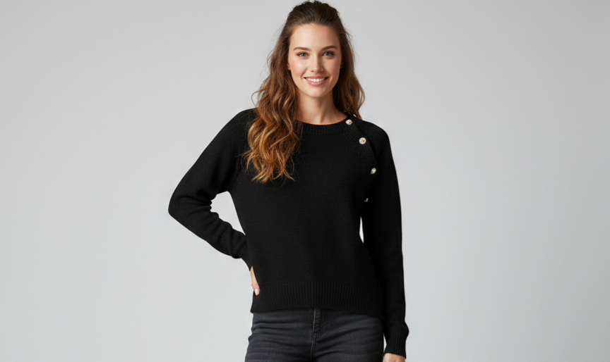 Maglione a manica lunga dal design pulito, arricchito da bottoni decorativi sulla spalla. Tessuto morbido e confortevole, vestibilità regolare. Un capo essenziale e versatile, ideale per look quotidiani curati.