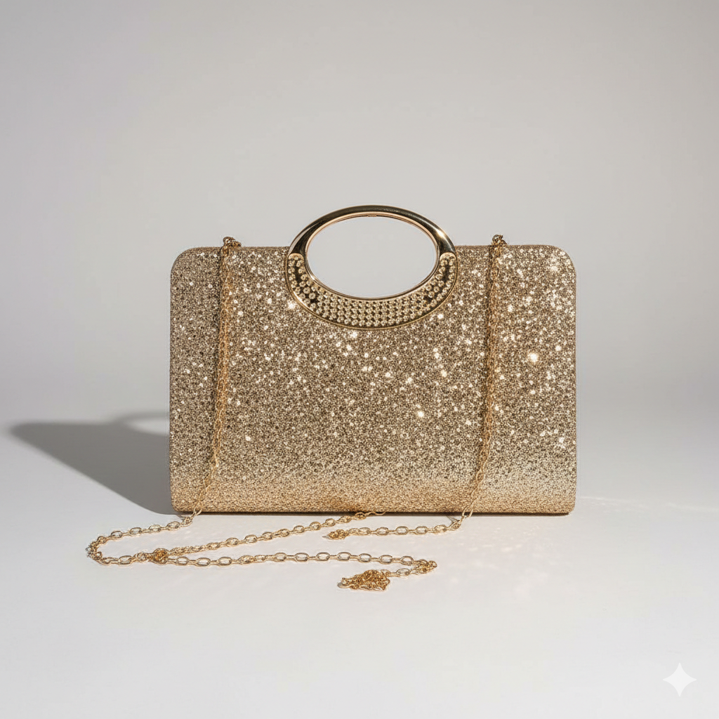 Brilla ad ogni passo con questa borsa glitter dorata, elegante e versatile. La tracolla a catena aggiunge un tocco di glamour, rendendola perfetta per completare i tuoi outfit più scintillanti