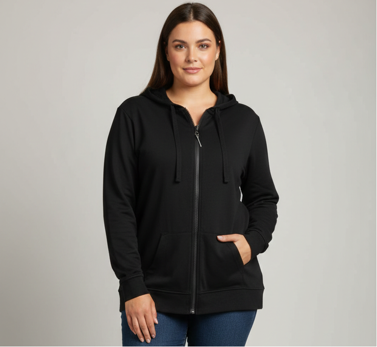 Felpa full zip con cappuccio, chiusura frontale con zip integrale fluida e cappuccio regolabile con cordini in tinta.