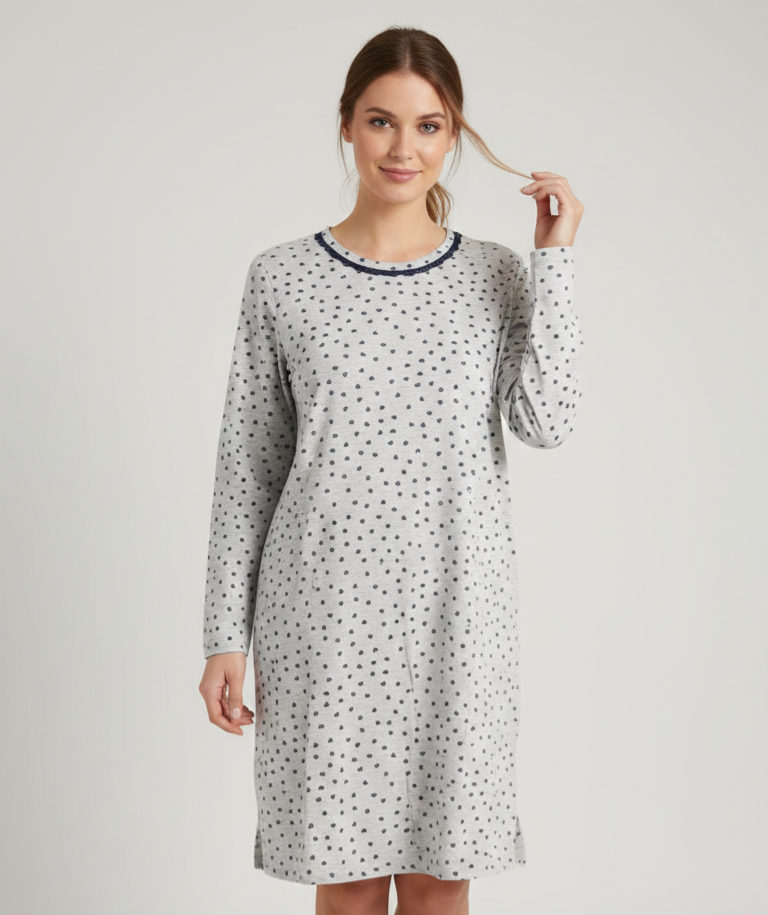 Camicia da notte a maniche lunghe, Caratterizzata da una delicata micro-fantasia a pois (piccoli cuoricini blu scuro) che aggiunge un carattere romantico e moderno al capo.Il girocollo è impreziosito da un bordino in pizzo blu a contrasto, che rifinisce il design con un tocco femminile e ricercato.Maniche lunghe per le stagioni più fresche e piccoli spacchetti laterali al fondo per favorire la camminata e il comfort a letto.