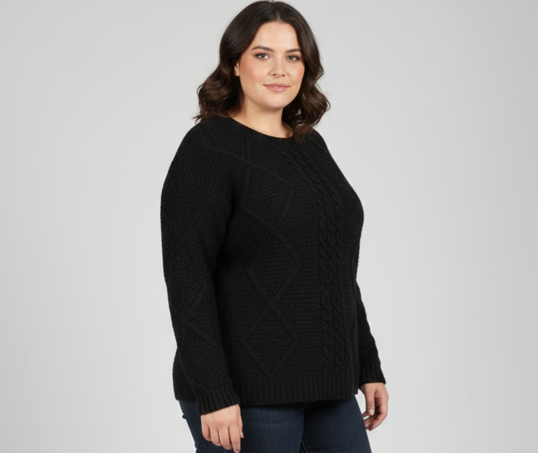 Maglione in maglia lavorata a trecce, il pannello frontale presenta un elegante motivo a trecce verticali e rombi in rilievo che donano profondità e struttura al capo.Taglio morbido con maniche lunghe e polsini a costine, ideale per un look casual-chic o per essere indossato sopra una camicia.Il bordo inferiore e il girocollo sono rifiniti a costine per mantenere la forma nel tempo e garantire una vestibilità perfetta.