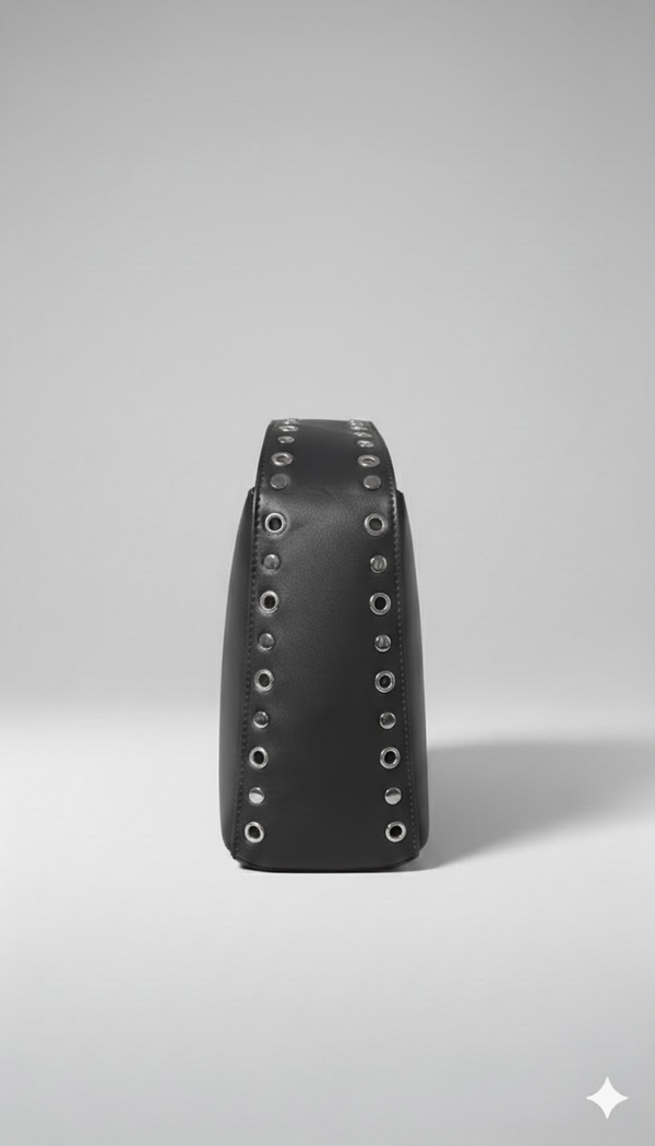 La borsa presenta una forma rettangolare strutturata, realizzata in similpelle nera dalla texture liscia e opaca. Appoggiata sulla parte superiore si trova una tracolla coordinata, caratterizzata da ampi occhielli metallici e una fibbia robusta, ideale per un look versatile.