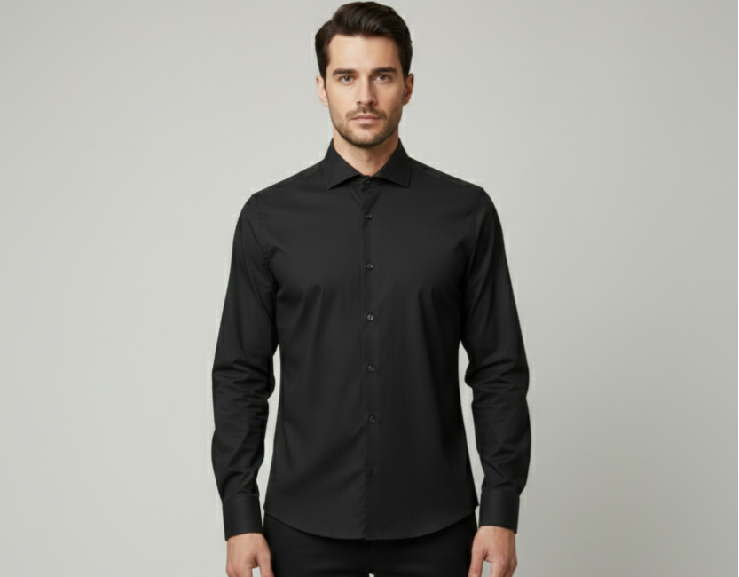 Eleva il tuo guardaroba con la nostra camicia nera formale, un pezzo fondamentale che coniuga eleganza sartoriale e comfort moderno. Progettata per l'uomo che cerca un look impeccabile, questa camicia si distingue per la sua versatilità, passando con disinvoltura dall'ufficio a un evento serale.