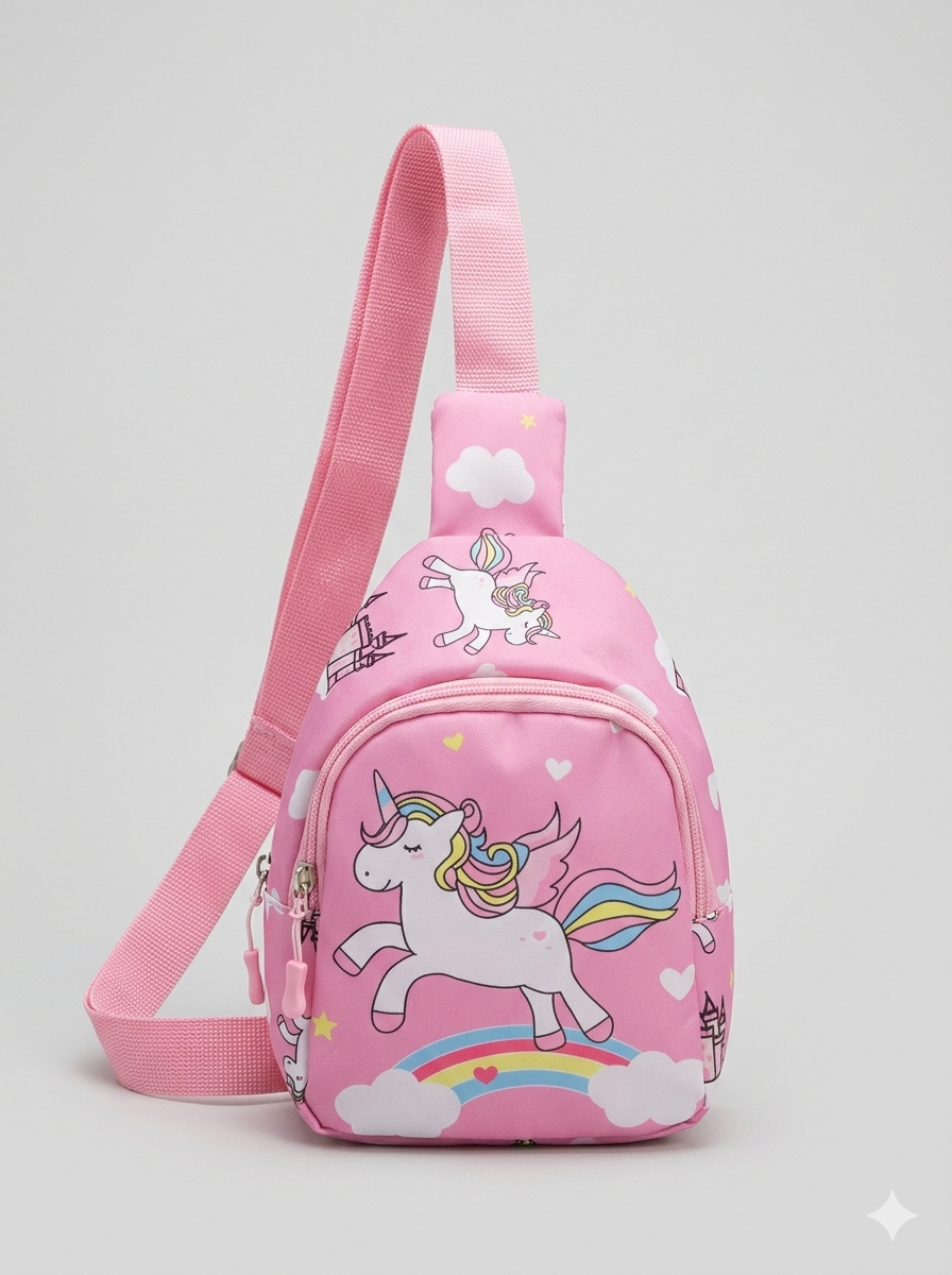 Aggiungi un tocco di magia alle avventure quotidiane della tua bambina! Questo mini zainetto monospalla è l'accessorio perfetto per chi ama sognare. Caratterizzato da una dolcissima stampa di unicorni alati, arcobaleni e castelli incantati, unisce stile e praticità in un formato compatto e leggero.