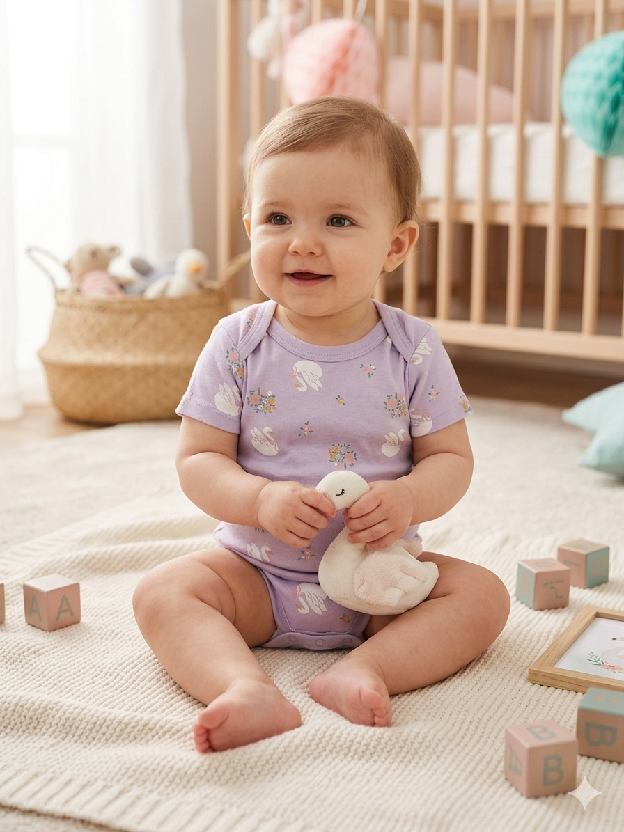 Aggiungi un tocco di dolcezza e delicatezza al guardaroba della tua bambina con questo splendido body a maniche corte. Caratterizzato da una raffinata tonalità lilla pastello, è impreziosito da una stampa all-over di eleganti cigni bianchi alternati a piccoli bouquet di fiori colorati.