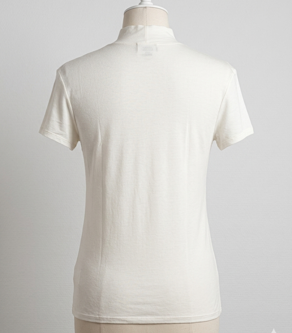 Rinnova i tuoi capi basic con questa esclusiva t-shirt a collo alto color panna. Coniugando perfettamente comfort e uno stile casual-chic, questa maglia è l'alleato ideale per creare look versatili e curati nei minimi dettagli.