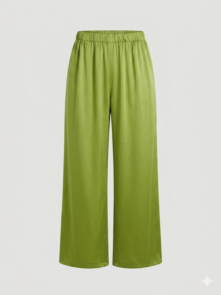 Il Pantalone: Taglio a gamba larga (palazzo) con vita elasticizzata per garantire una vestibilità perfetta senza rinunciare allo stile.